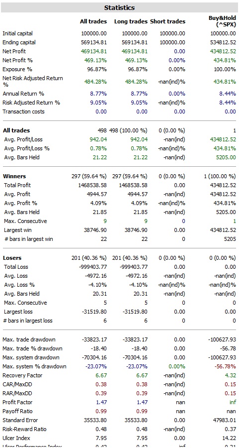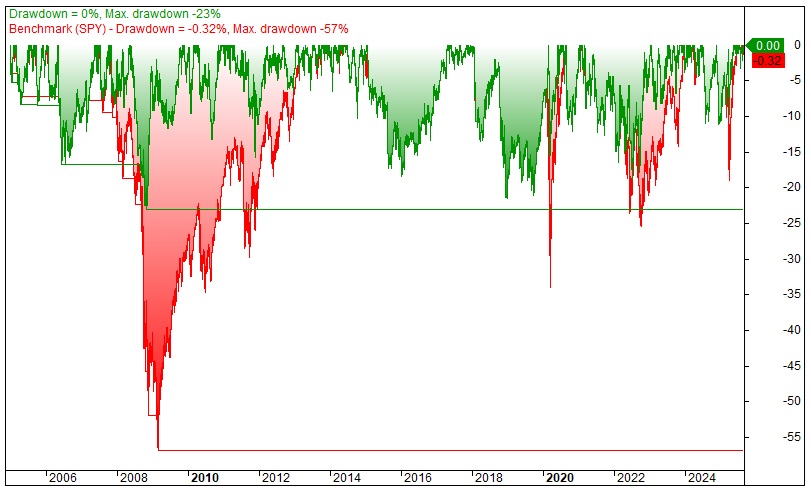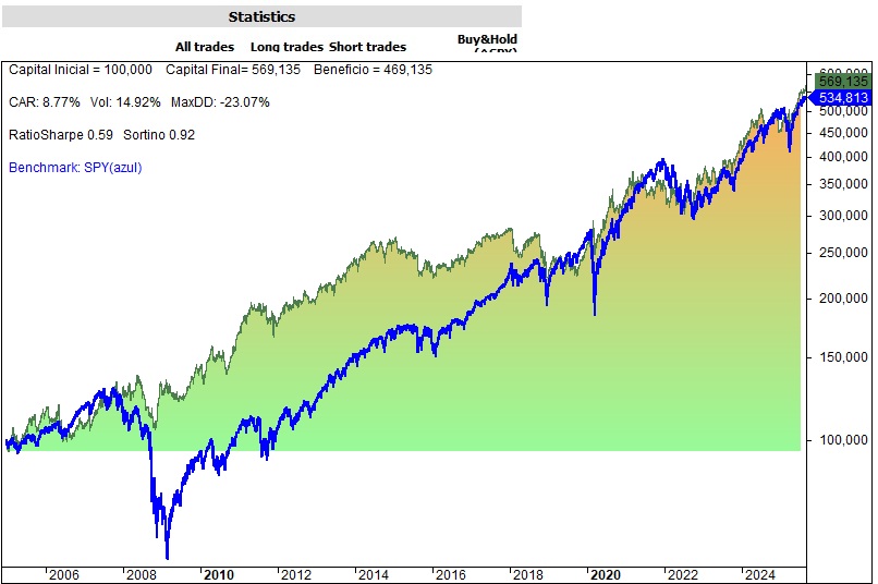 • Drawdown controlado: Un 23% de drawdown máximo no está mal para un sistema con casi 97% de exposición al mercado.